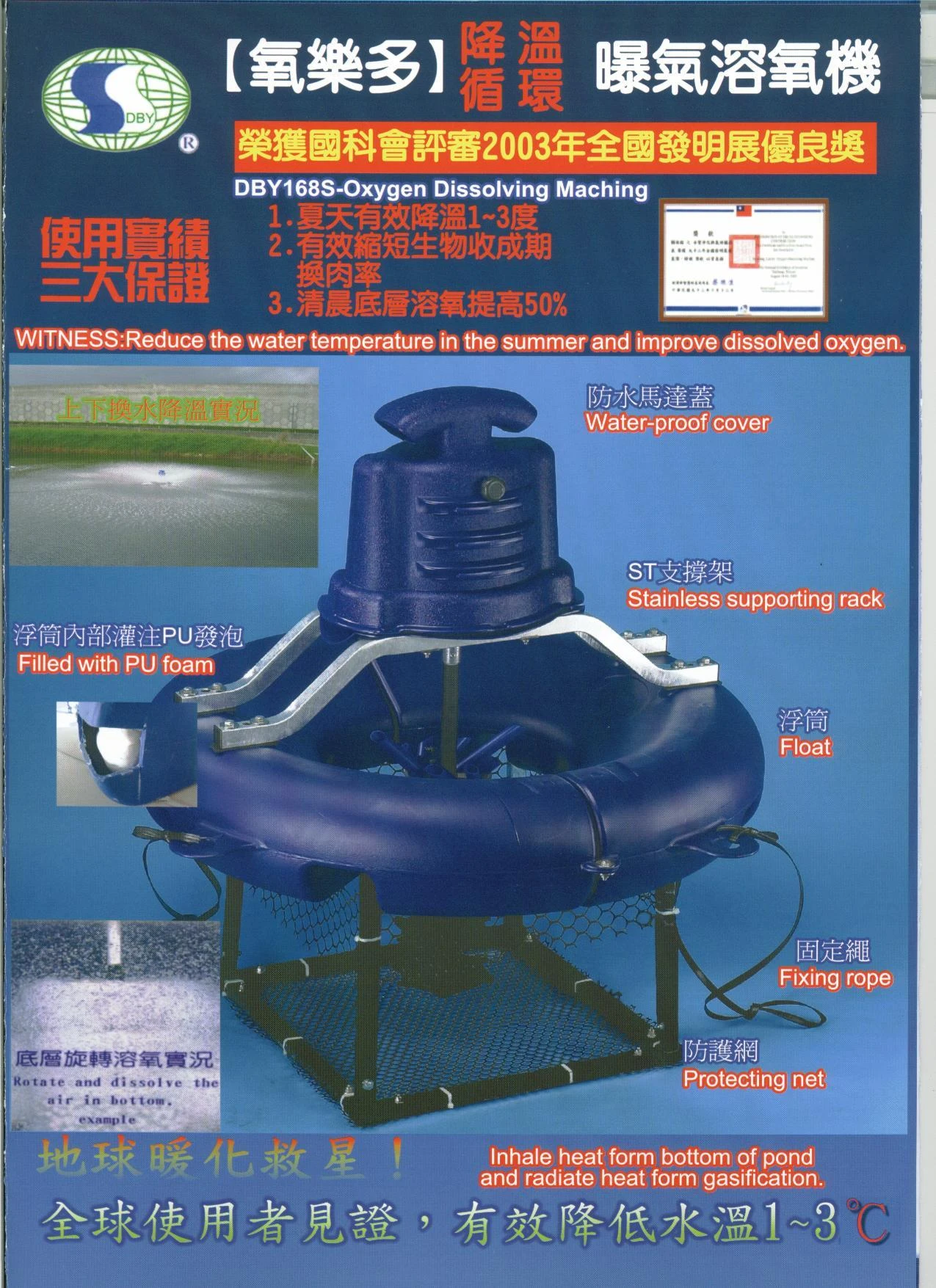 When the whirling axis is at 1-meter deep in water, its operation creates interactive circulation among the upper and lower currents, and the oxygen dissolution efficiency achieves 360 degrees with no dead space. The α left-whirl axis spurts the water of the bottom layer out of water-surface in a very short time to dissipate the heat at the floor fish farm in summer. The diameter of water-surface elevation is as wide as 9.5 meters at a height of 1.5 meters. In addition to attaining the purpose of surface-bottom circulation, UV rays in the sunlight eliminate disease germs in water, bottom-growing diatoms are spurted out of water surface to stabilize water algae, and the bottom layer temperature is lowered in a boiling hot summer. In this way, the fermentation of toxic gases caused by high temperatures, such as ammonia nitrogen, can be avoided, the survival rate of aquacultural animals is thus raised, and the number of catches increased. This product poses a strong contrast to traditional paddlewheel aerators that only agitate water